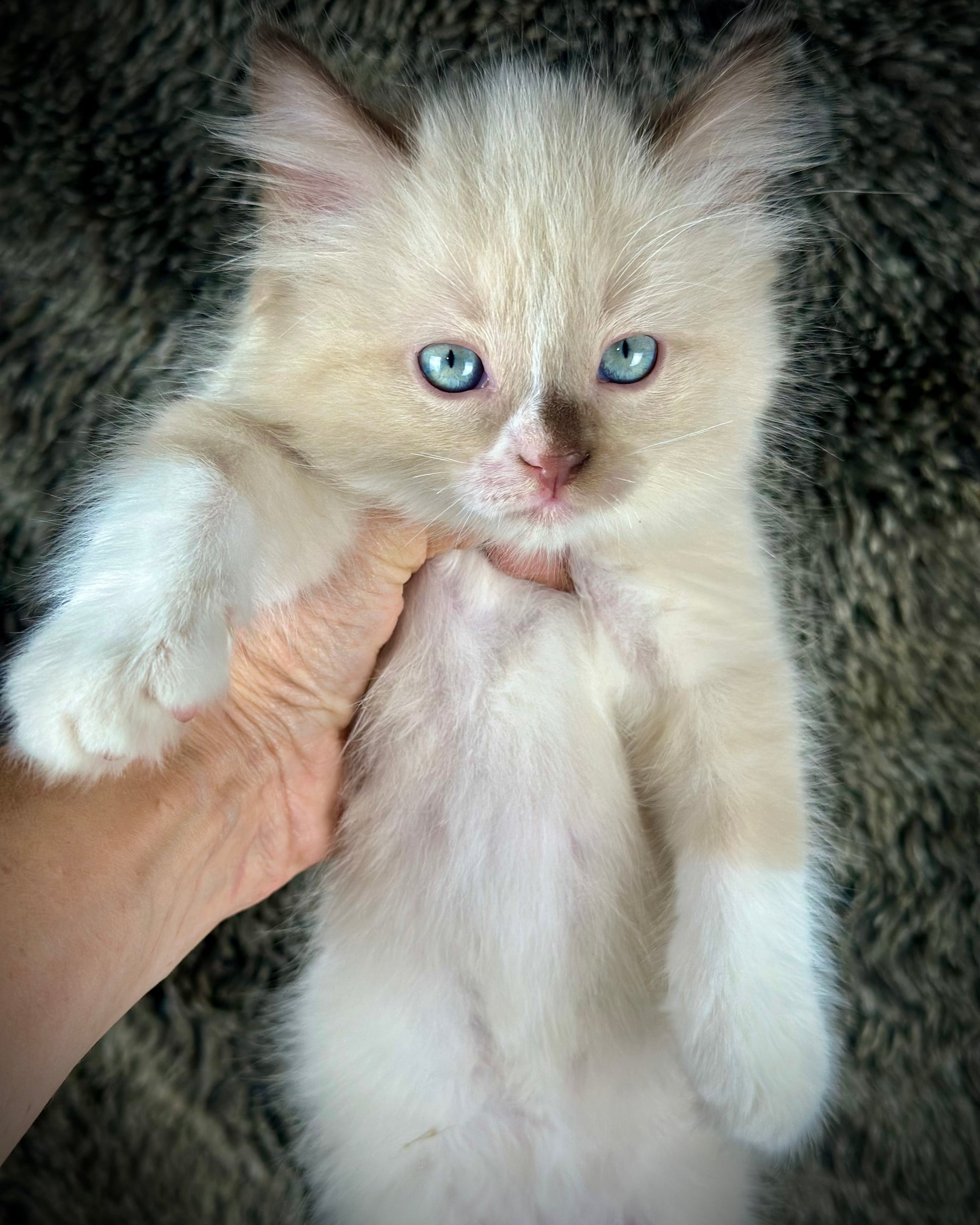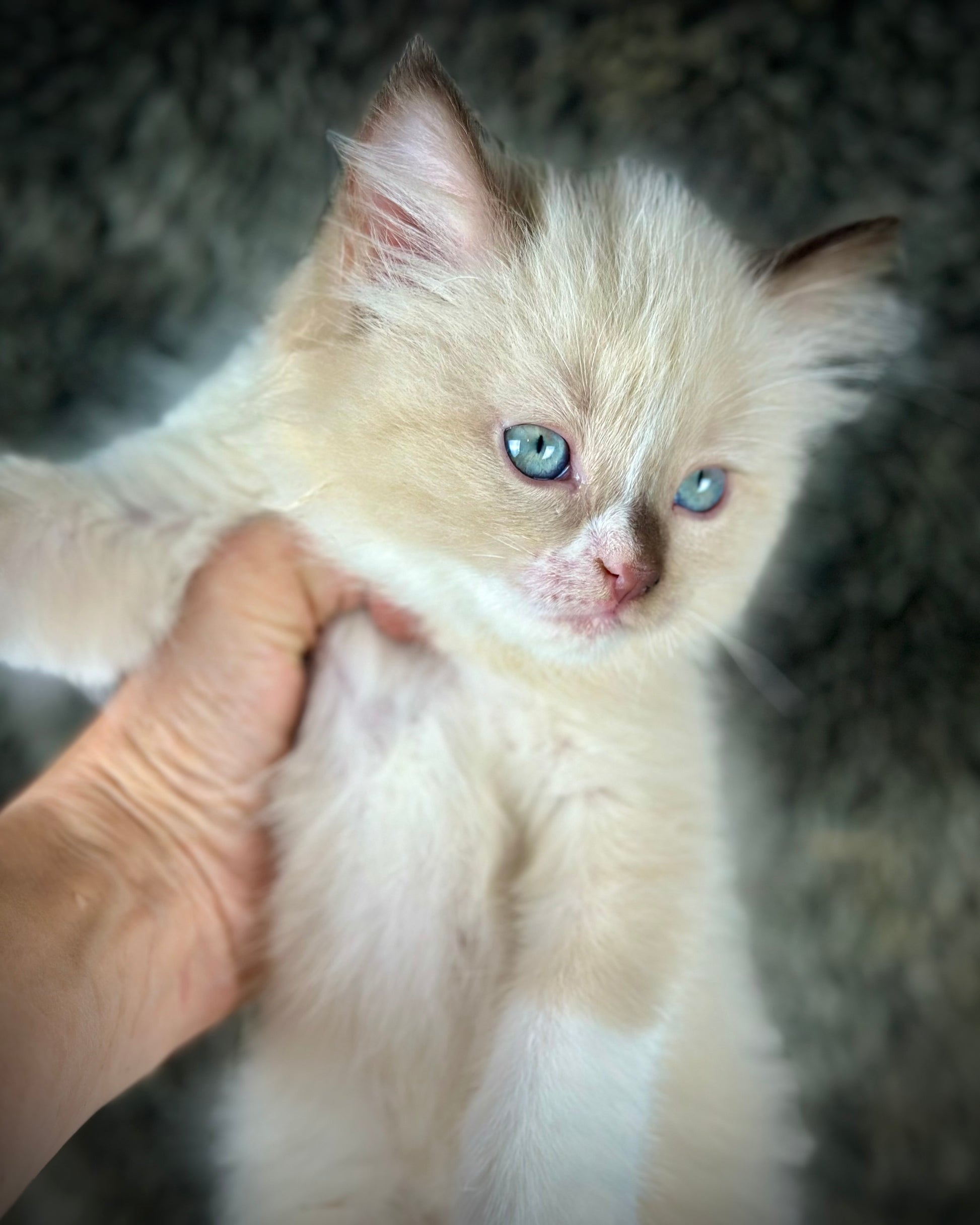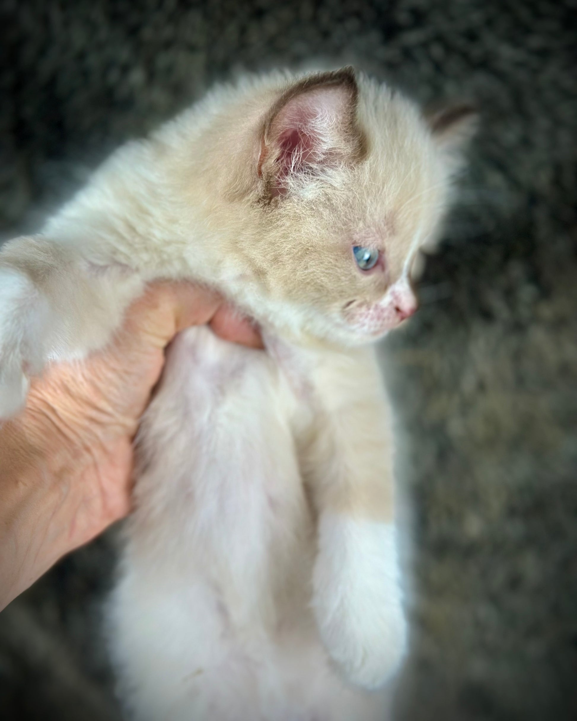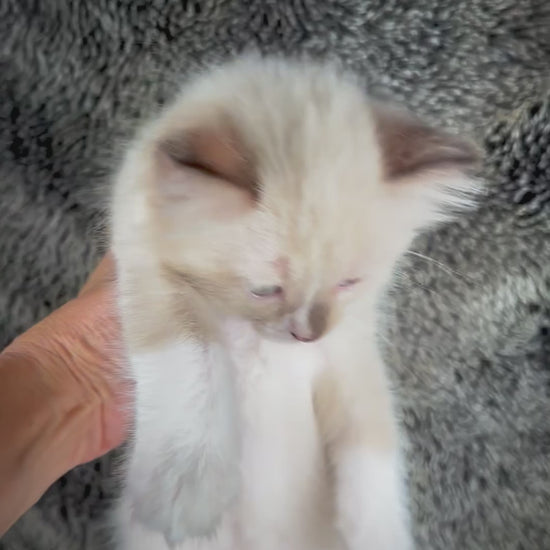 Akira is a crazy love bug, he’s on the bigger side and is a total floppy snuggle bug. His color is coming in and he’s a chocolate mink with mitted and an offset blaze. In our line that means he will be a beautiful warm caramel when he’s older with darker points.