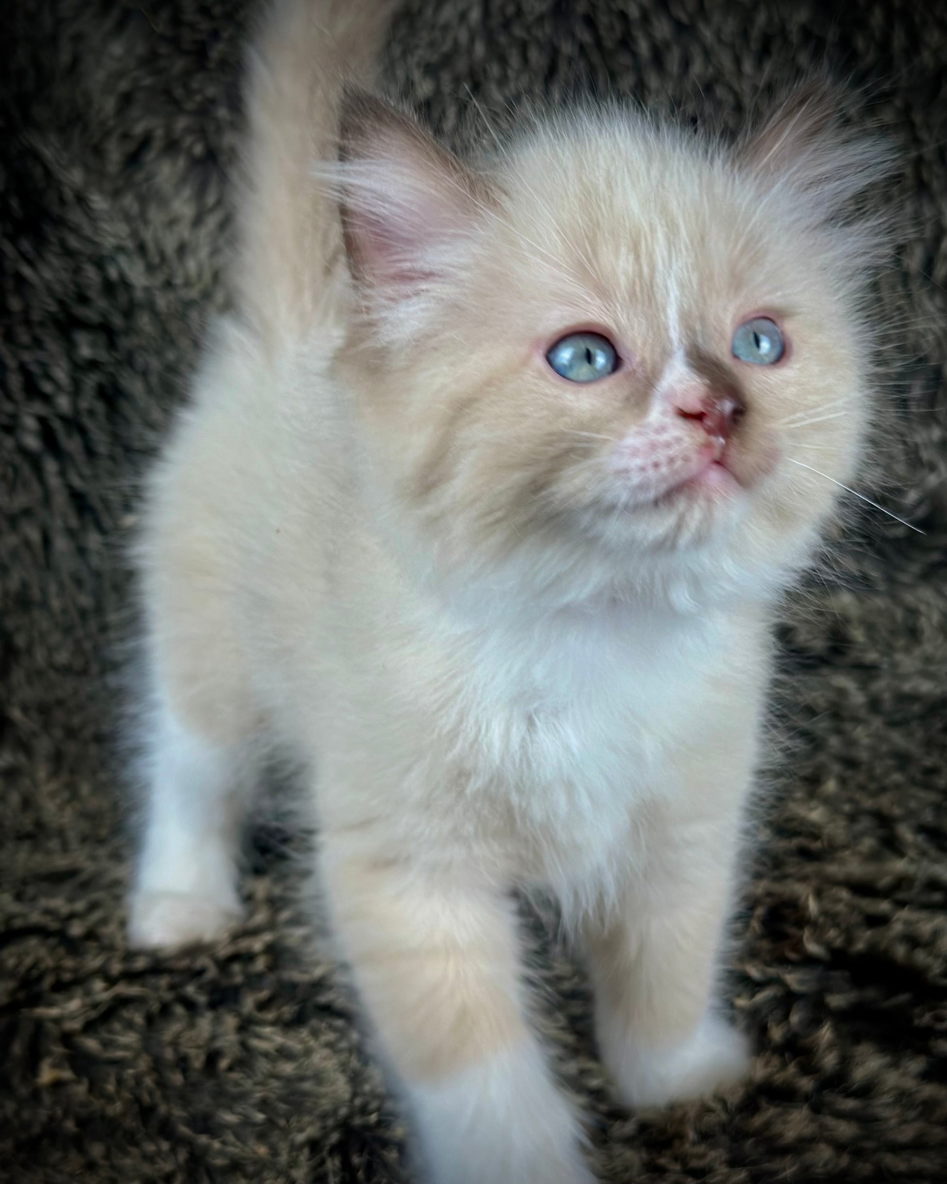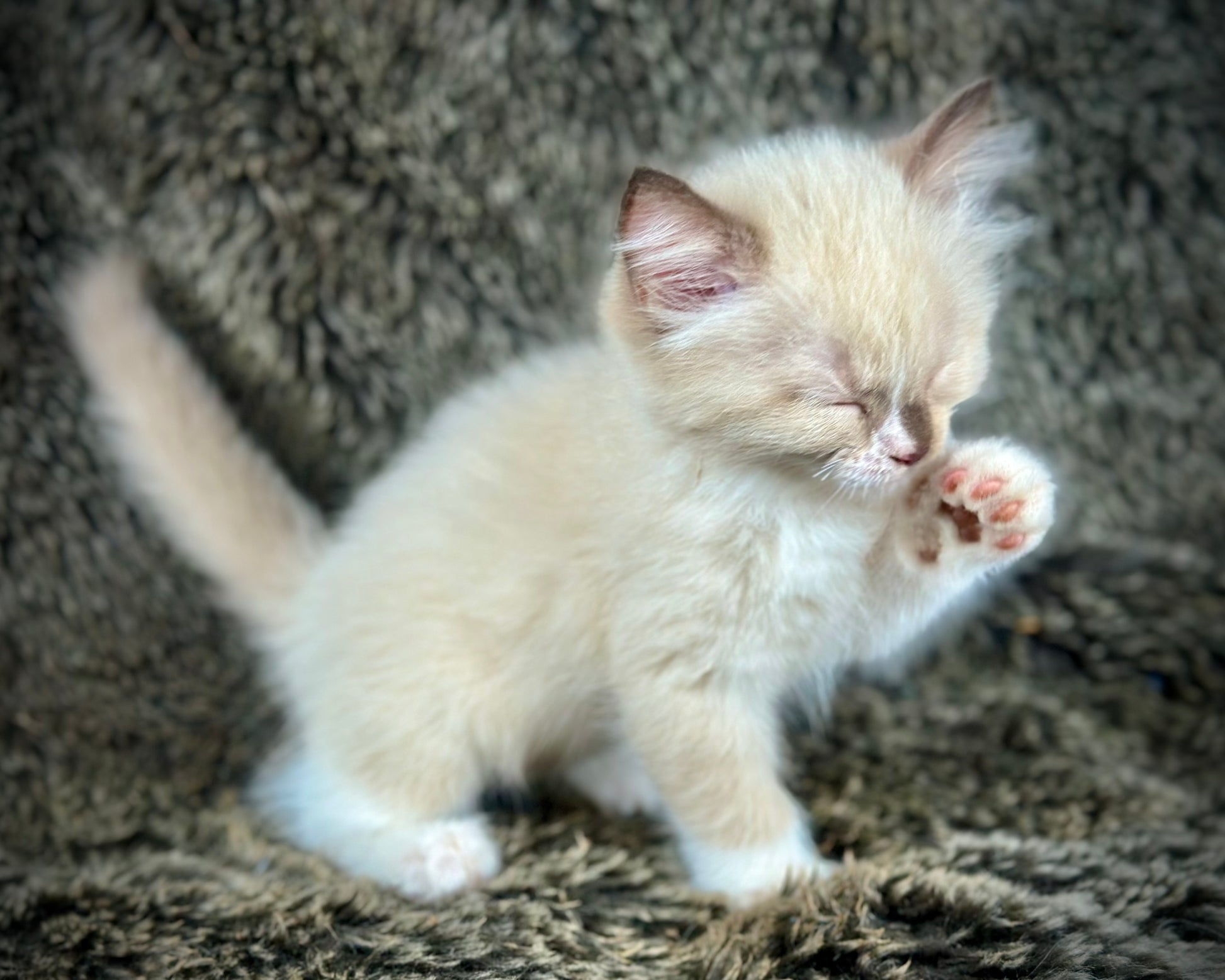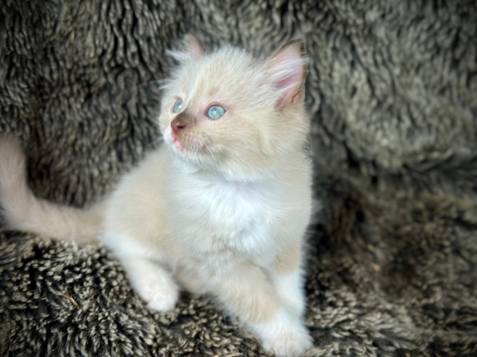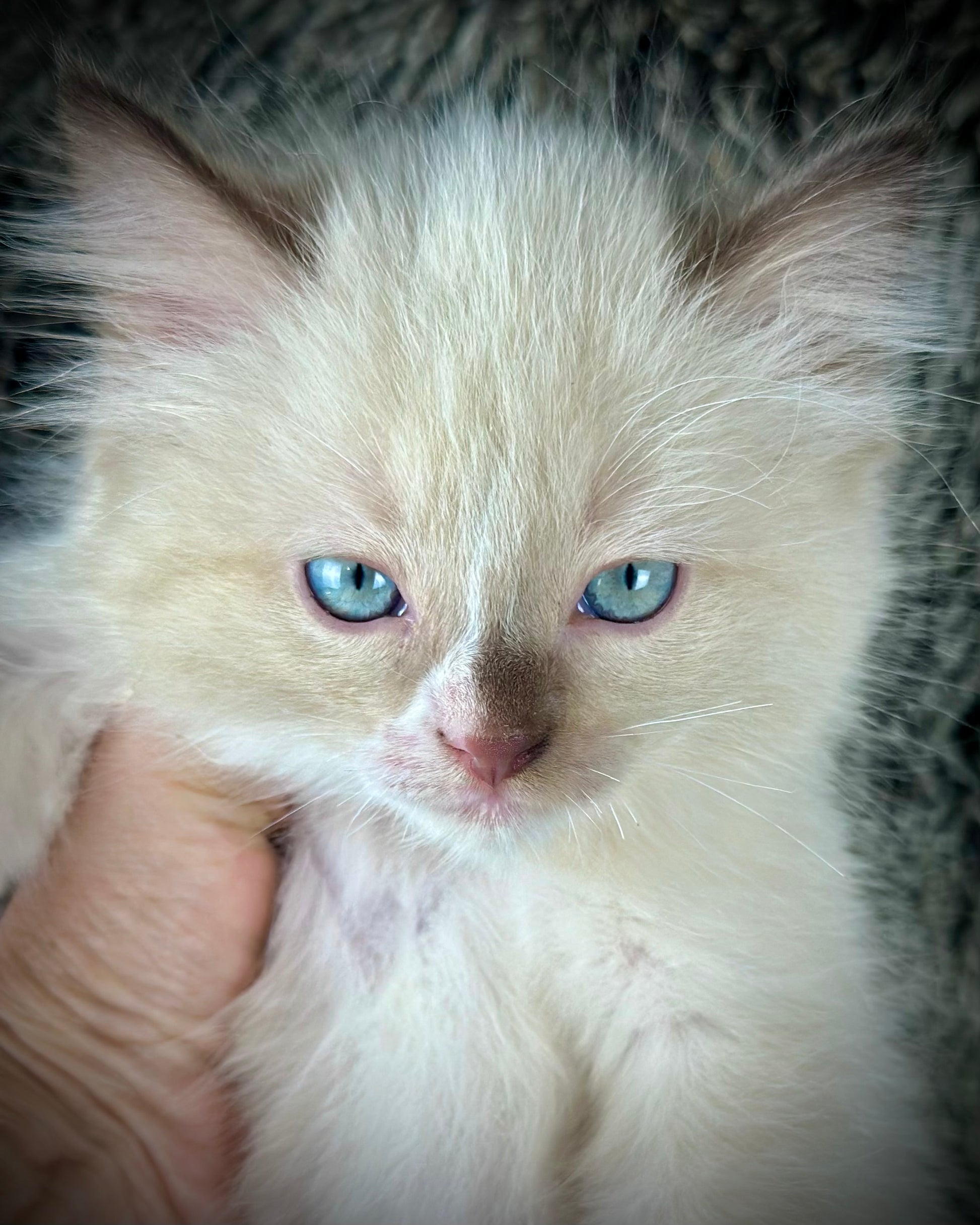 Akira is a crazy love bug, he’s on the bigger side and is a total floppy snuggle bug. His color is coming in and he’s a chocolate mink with mitted and an offset blaze. In our line that means he will be a beautiful warm caramel when he’s older with darker points.