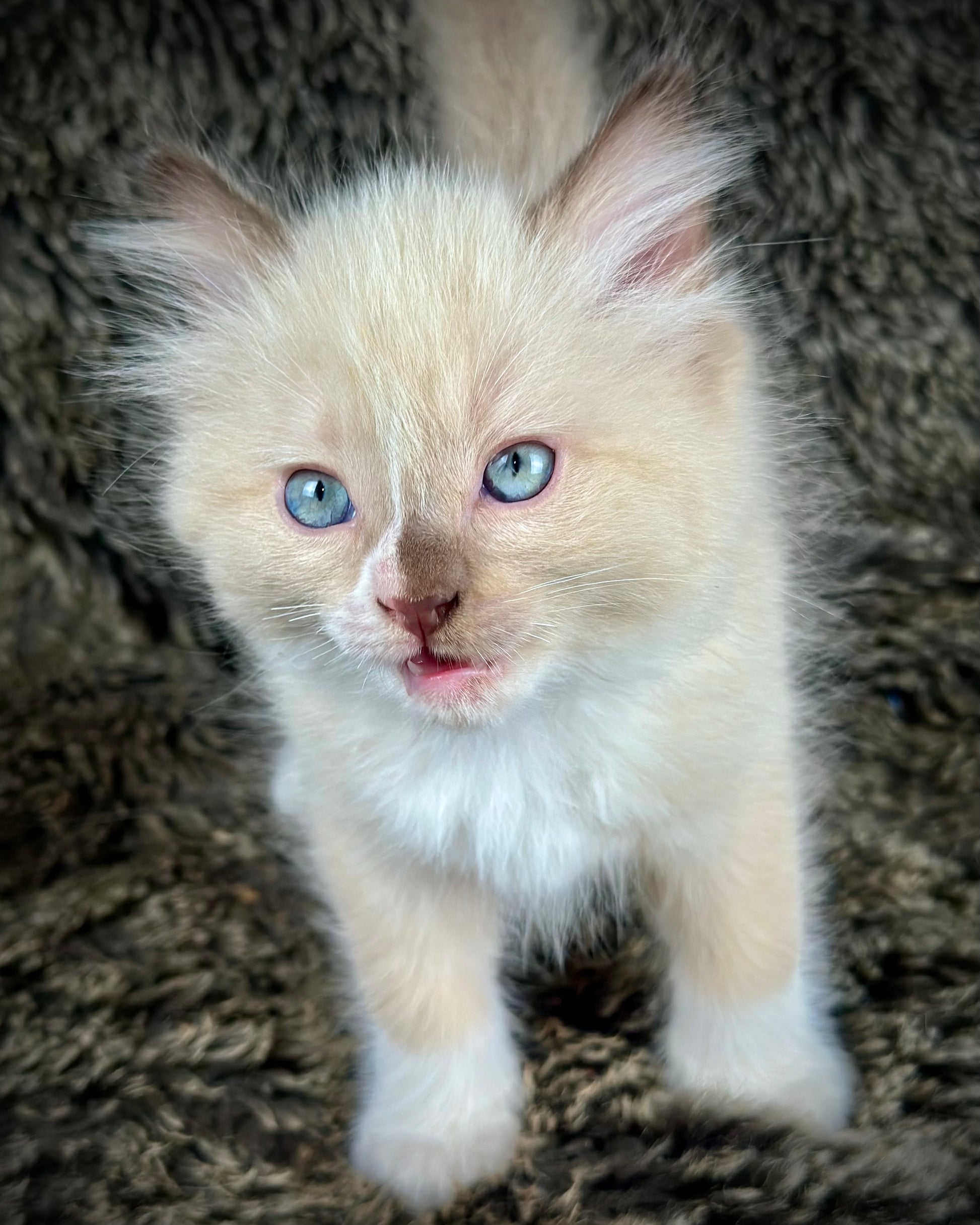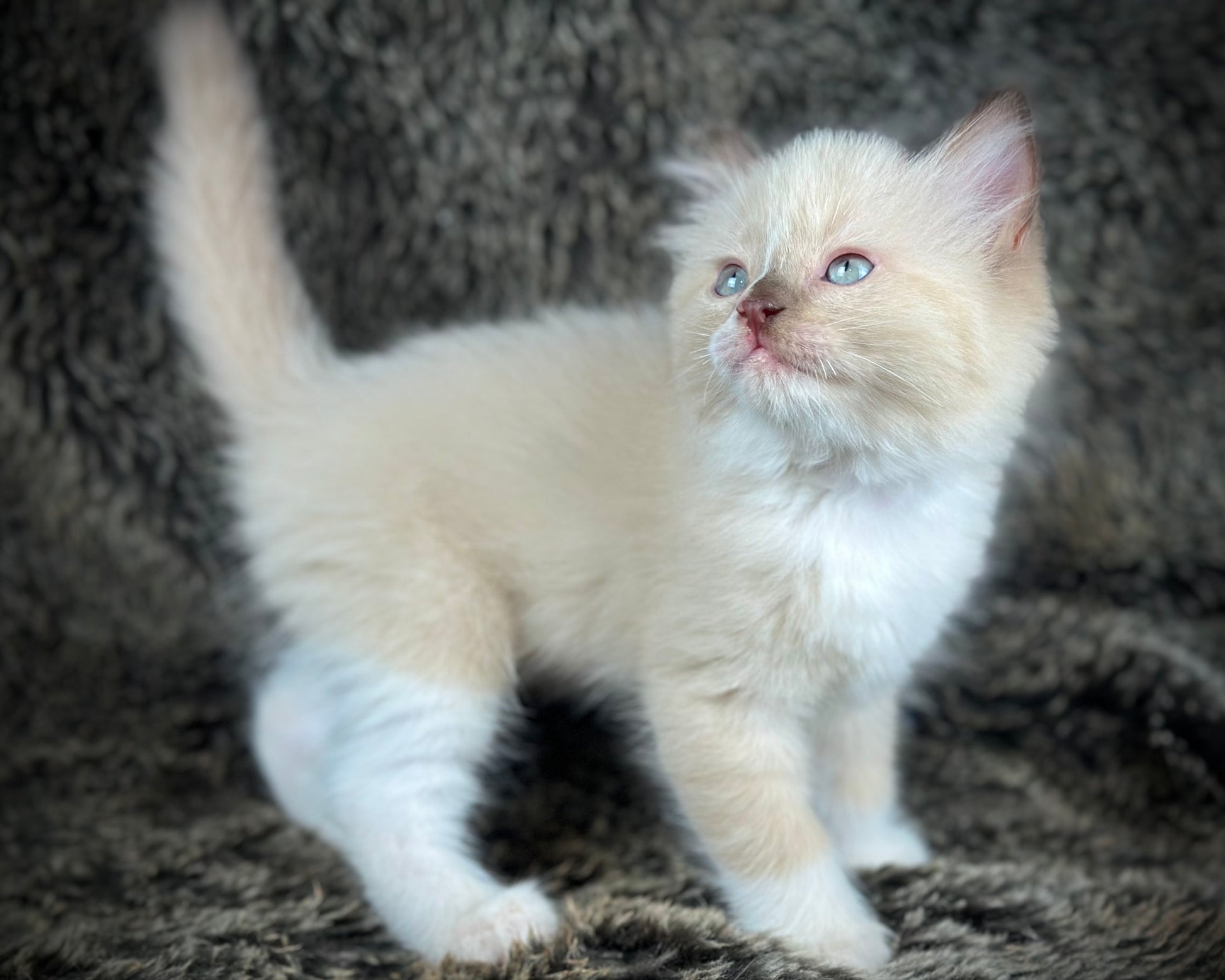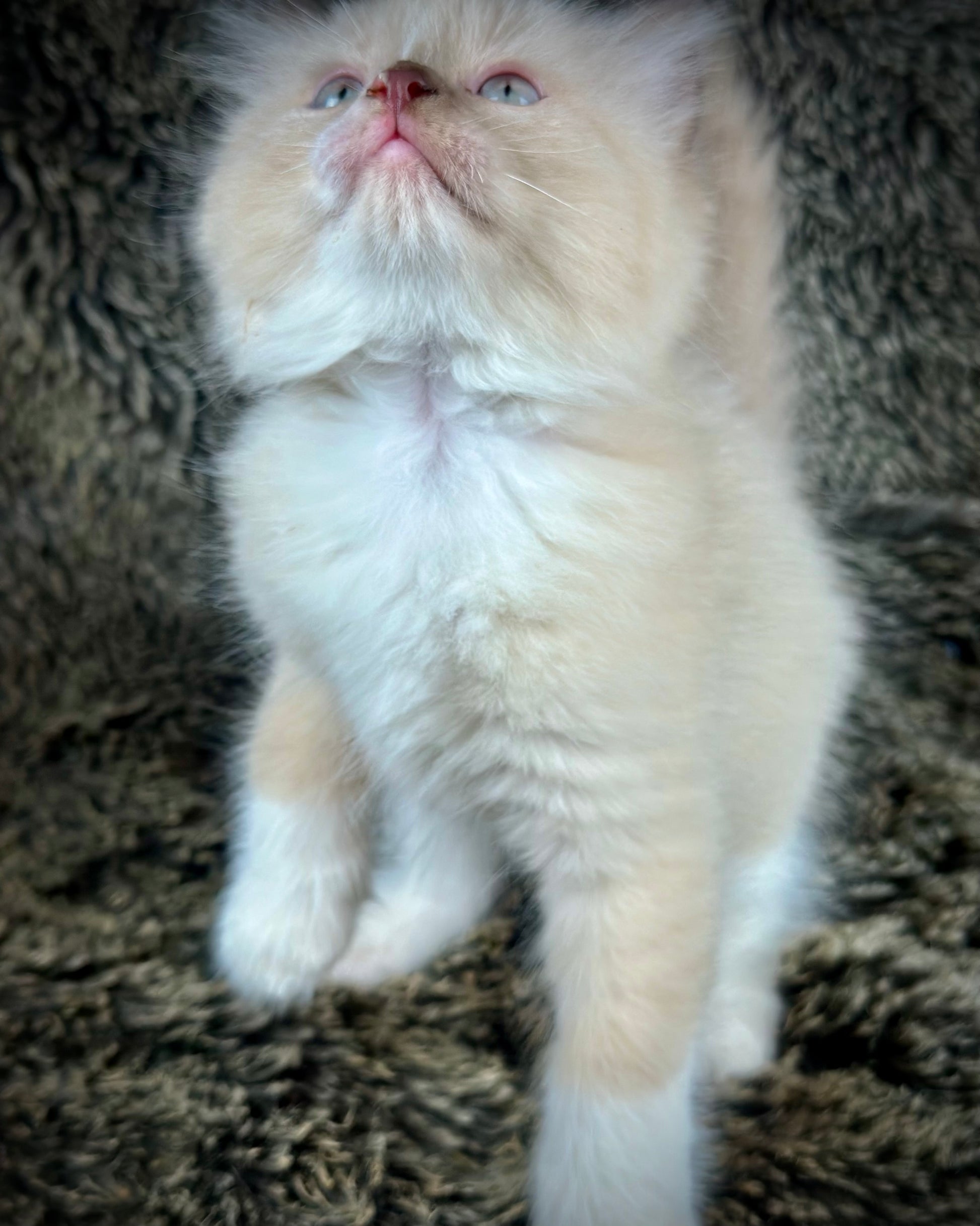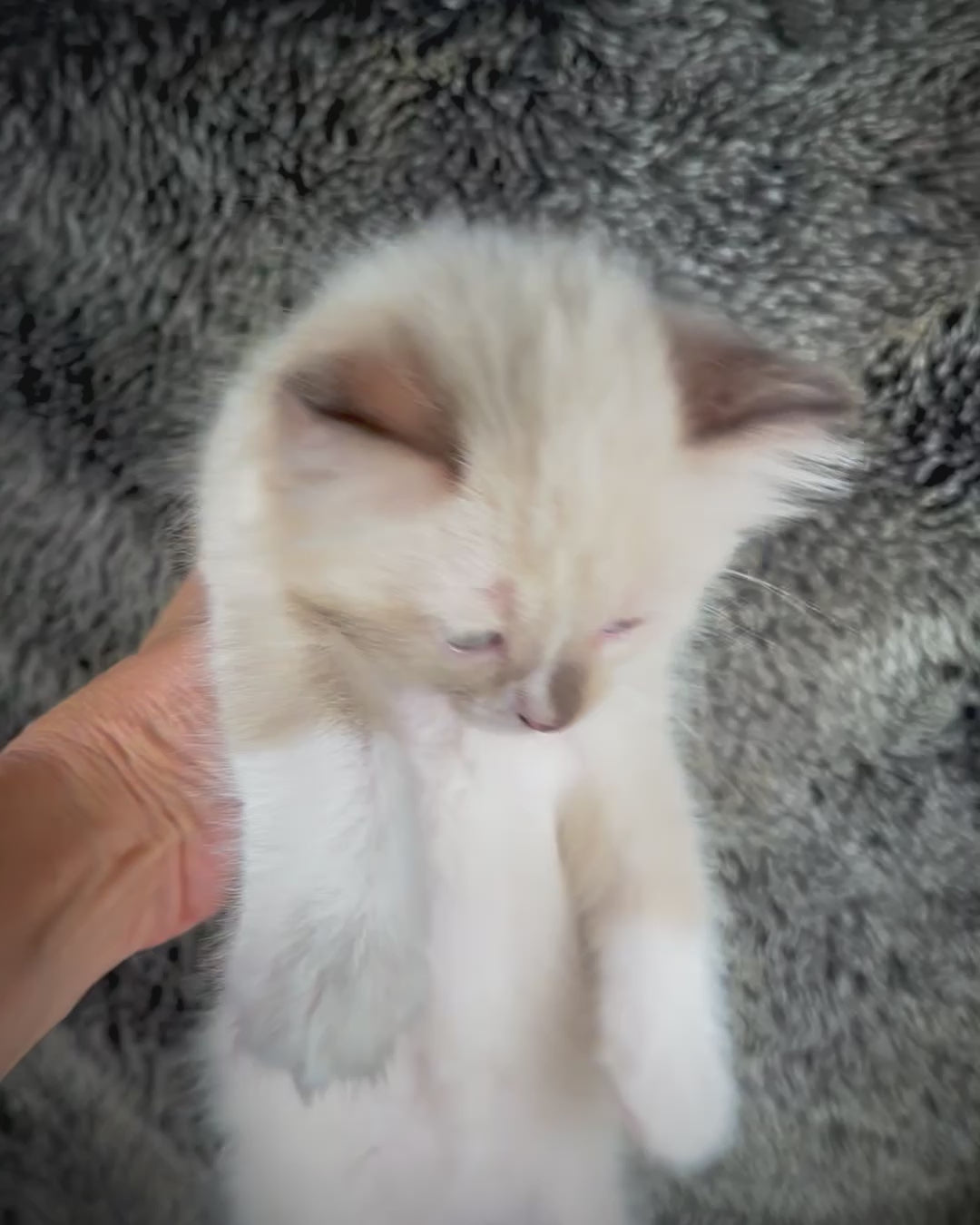 Akira is a crazy love bug, he’s on the bigger side and is a total floppy snuggle bug. His color is coming in and he’s a chocolate mink with mitted and an offset blaze. In our line that means he will be a beautiful warm caramel when he’s older with darker points.