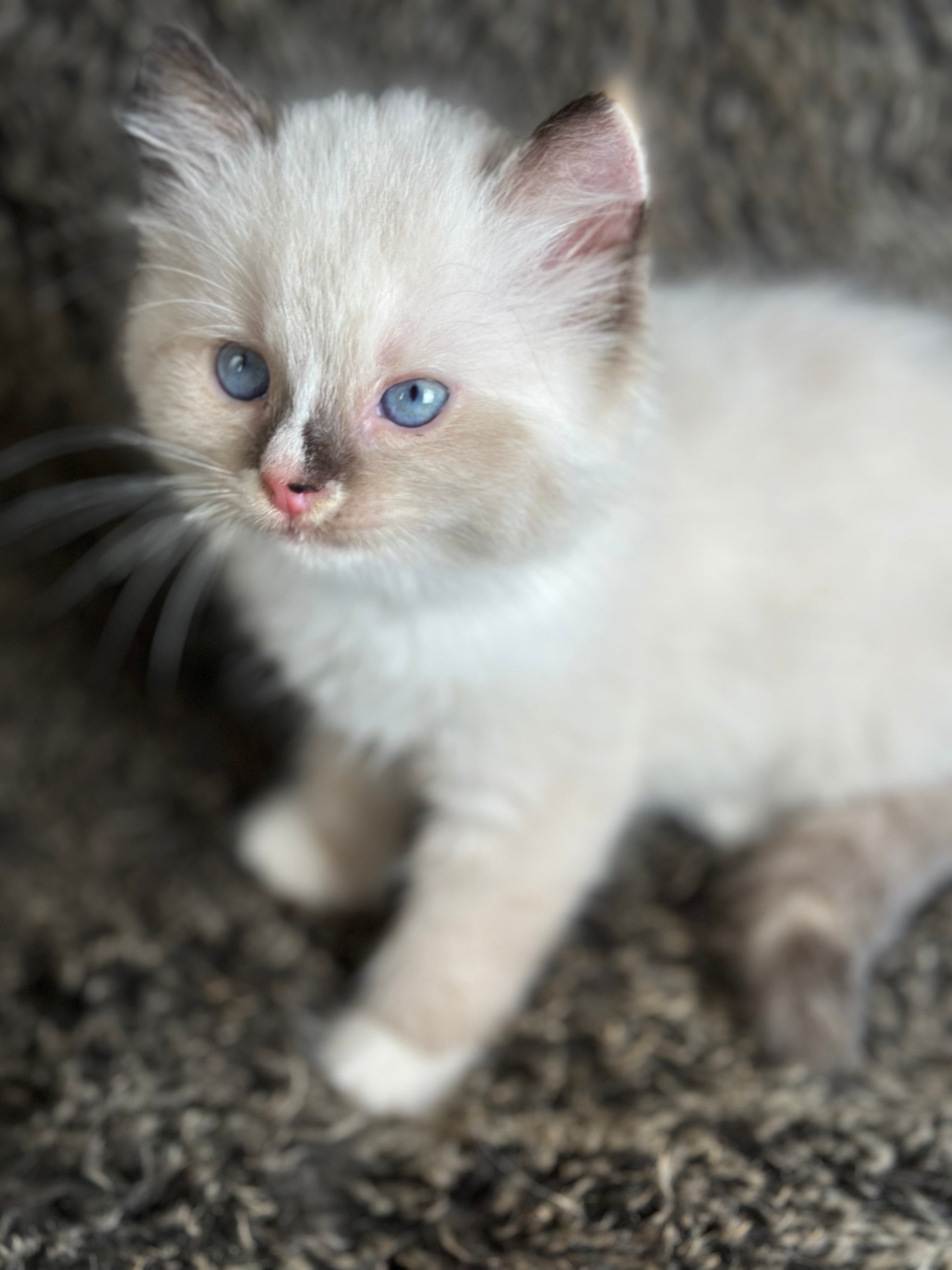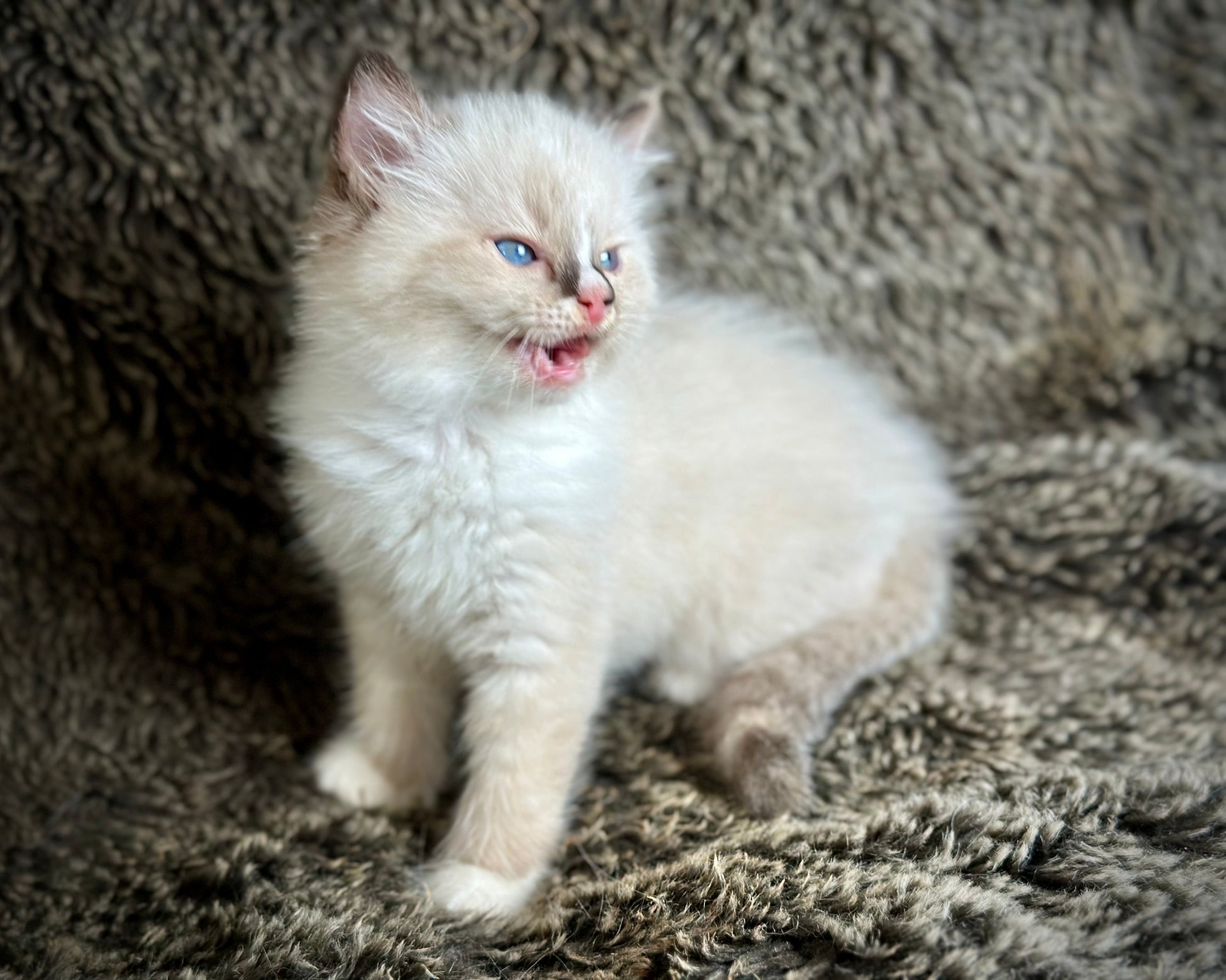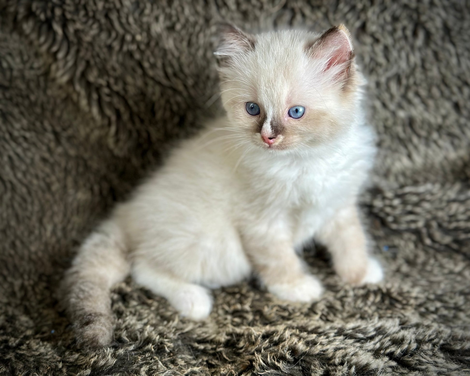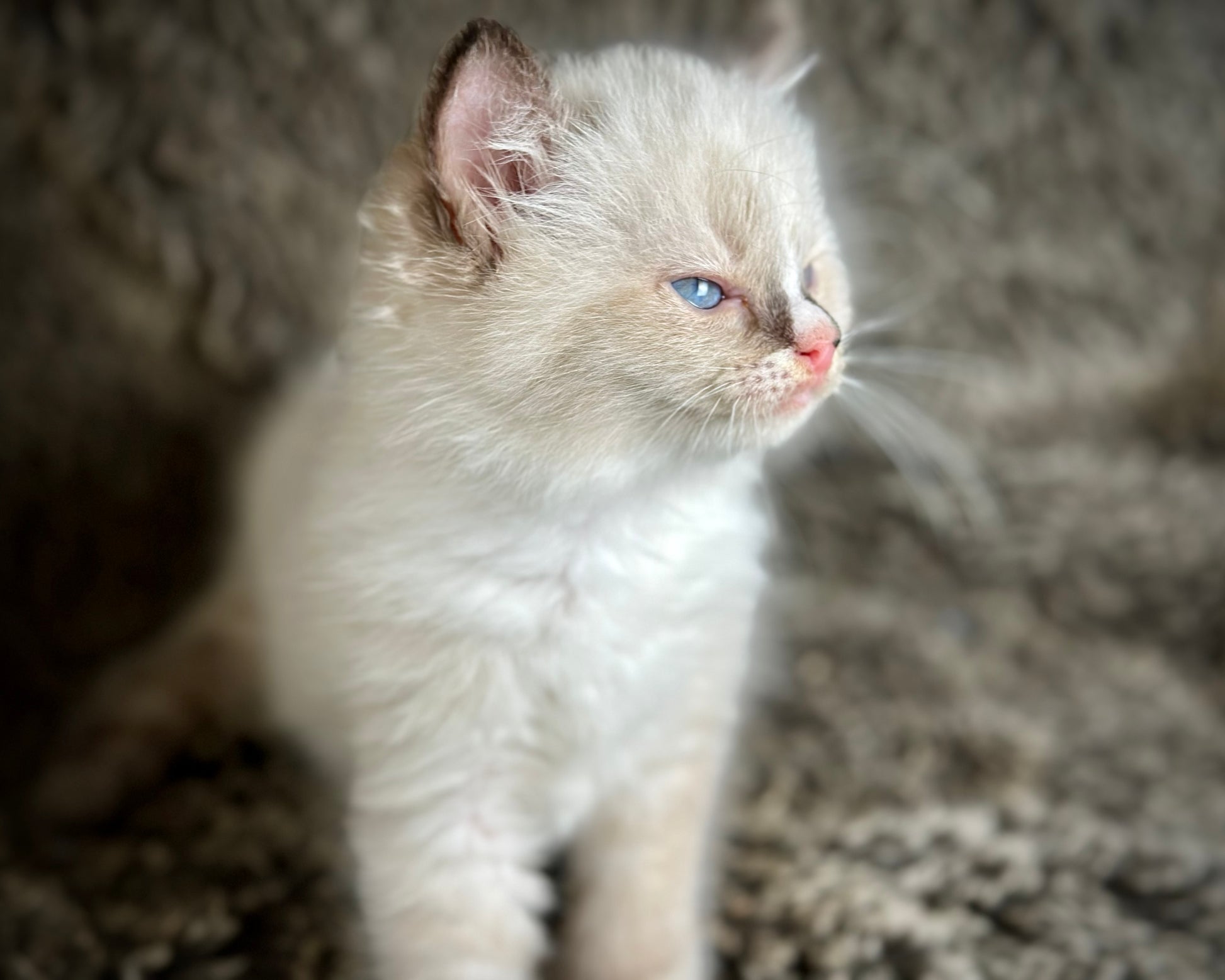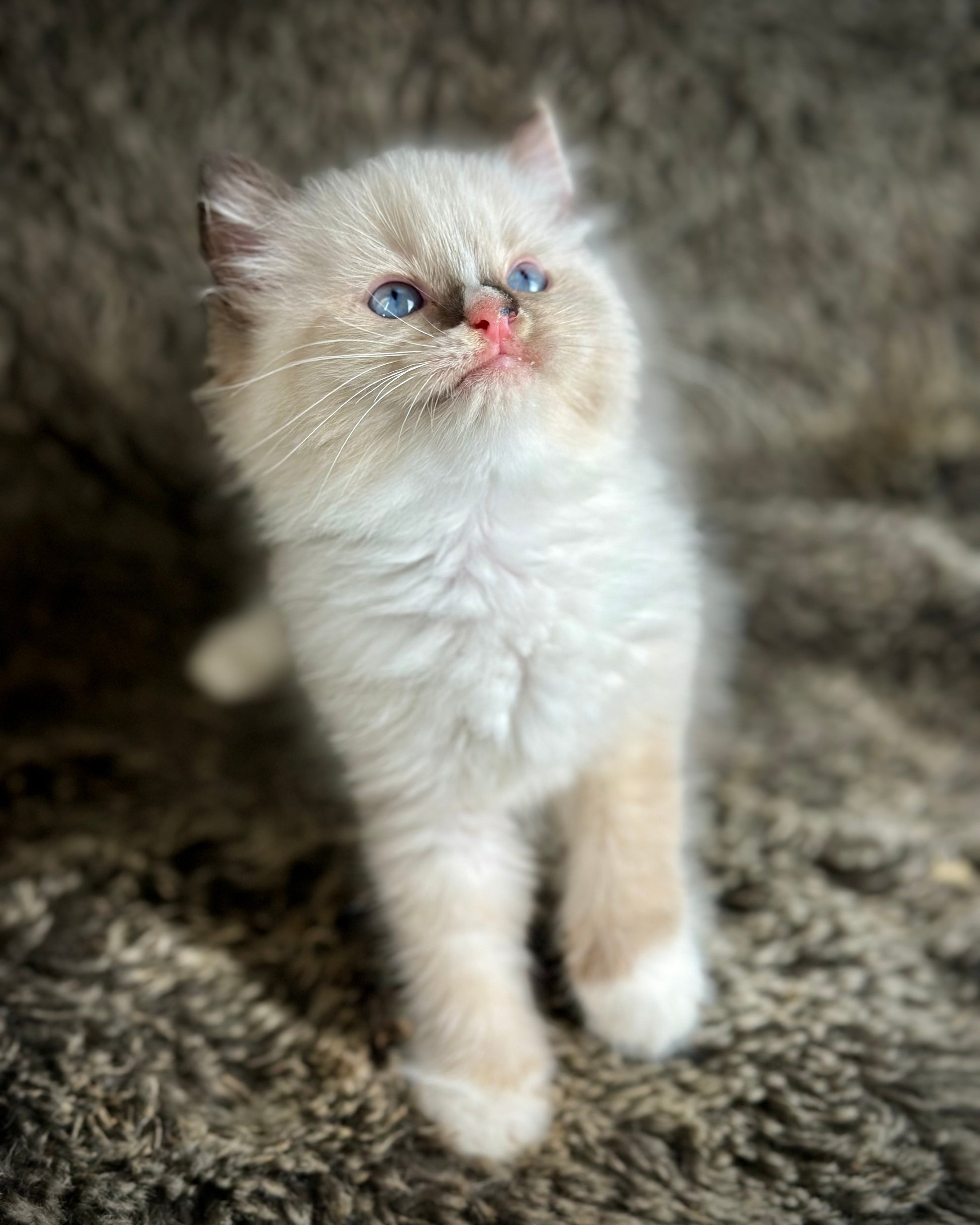Cranberry is that sweet sauce that makes everything extra special. She has the most adorable personality and is always ready to cuddle. Like her brothers she loves to play and snuggle and has that super laid back Ragdoll attitude that we all love. Her markings are super rare with a combo of tortie points, a creamy body with the added bonus of mittens and a blaze!