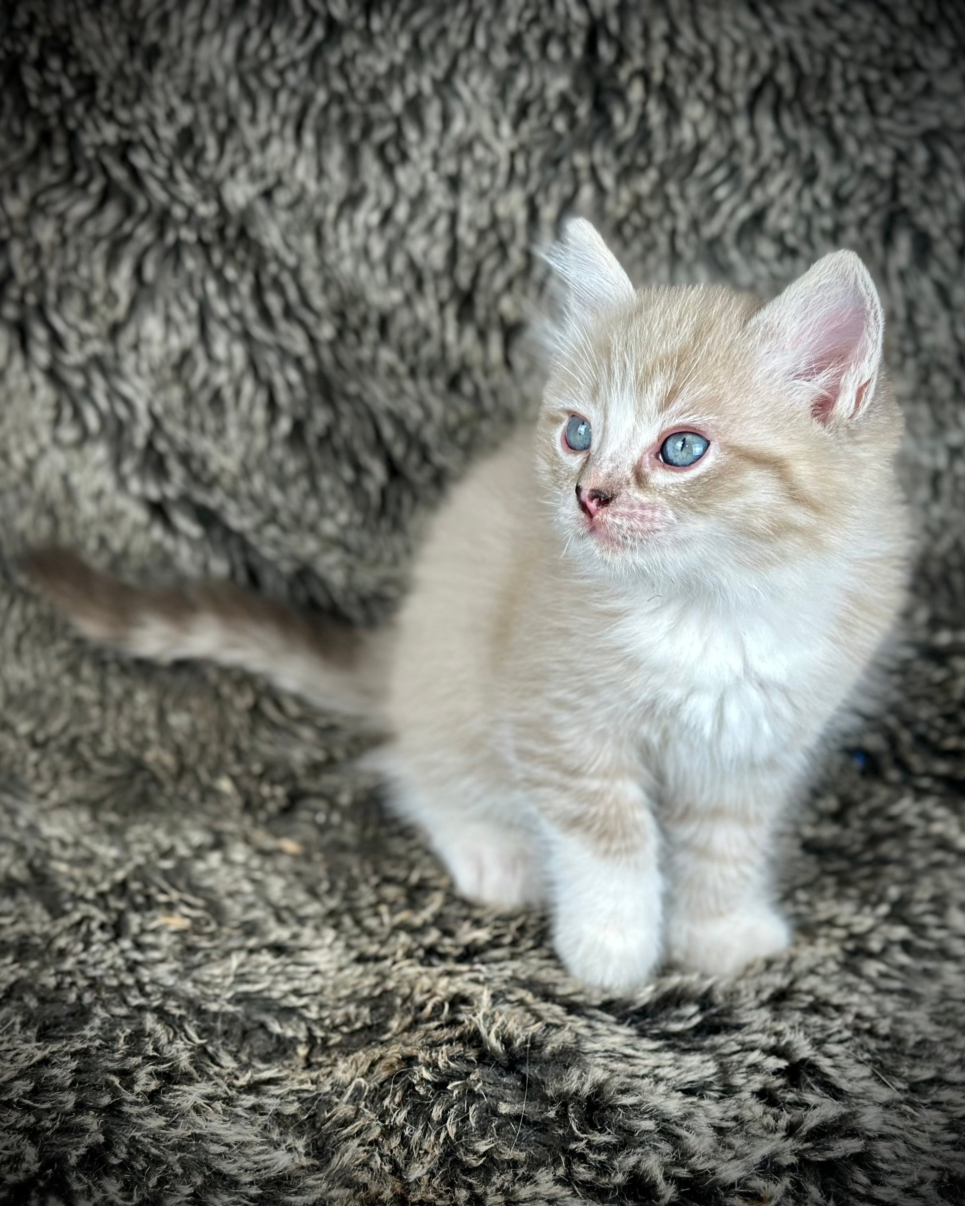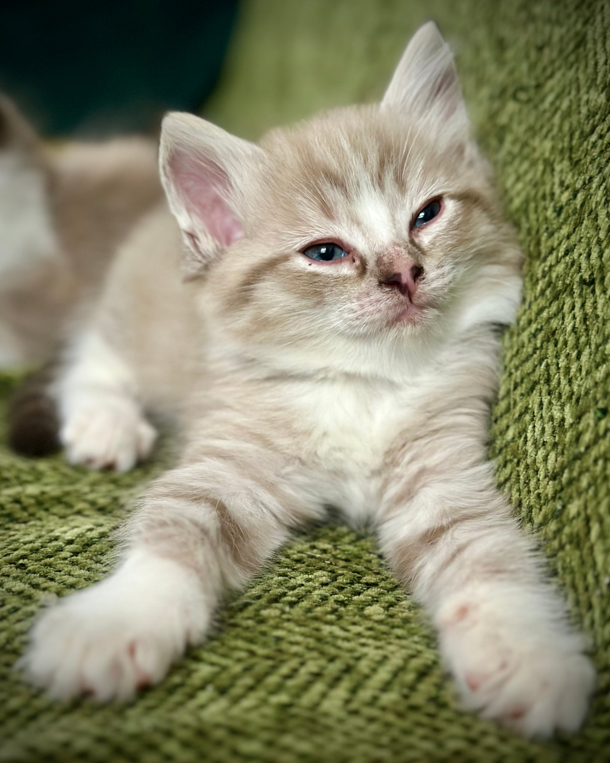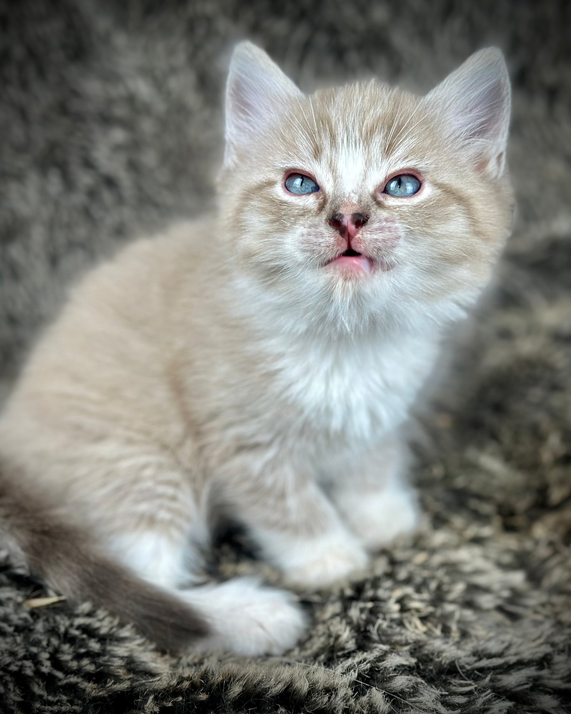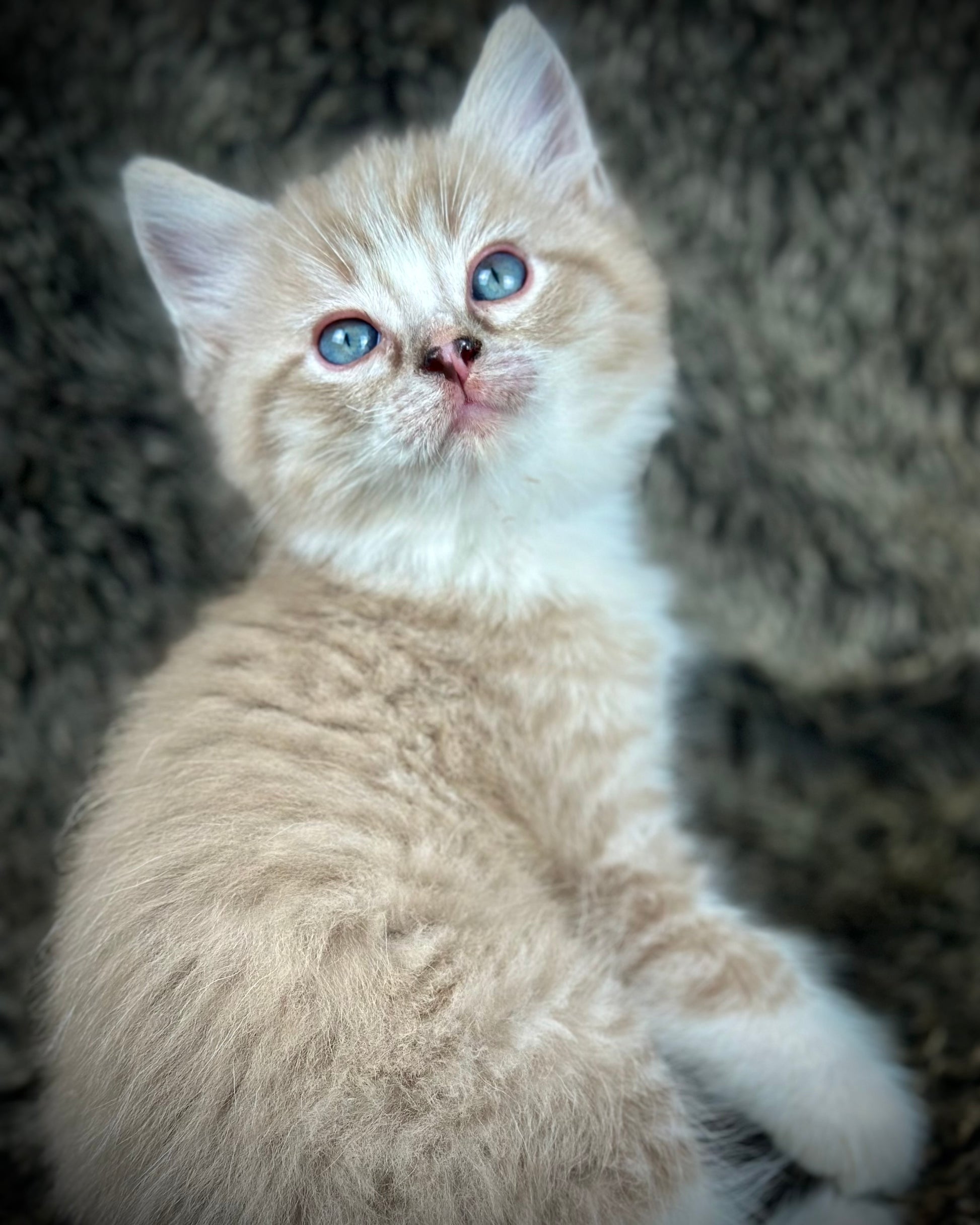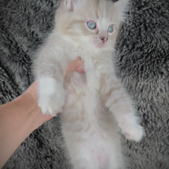 Here's Ichiban. He is our first seal sepia Lynx ever and he comes dressed in with mittens, a bib and a blaze to boot! He will darken significantly and his markings will pop. His eyes end up colored aqua to green. He's a super special and are little guy. And so social too!